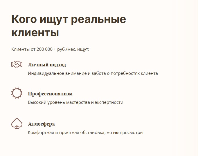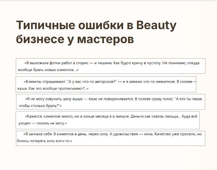 После вашей лекции я пересмотрела свой подход к ценам и работе. Я поняла, как можно зарабатывать даже в этом сегменте, не занижая цену, а наоборот — повышая её! Сейчас мой доход увеличился, а уверенность в себе просто зашкаливает!"